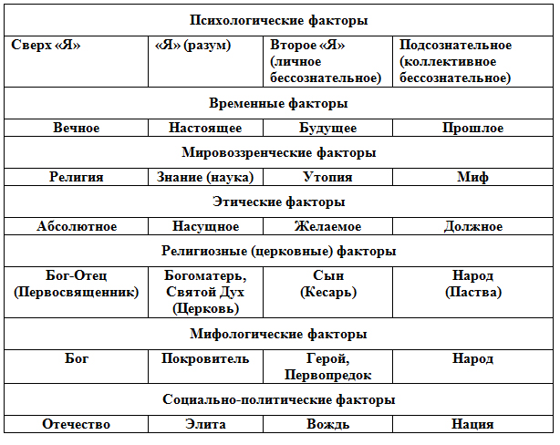Для ясности, необходимой при уяснении взаимоотношения мифологического и политического, психологического и религиозного, сведем затронутые в предыдущих разделах понятия в Таблицу.