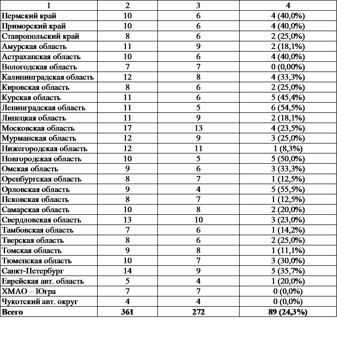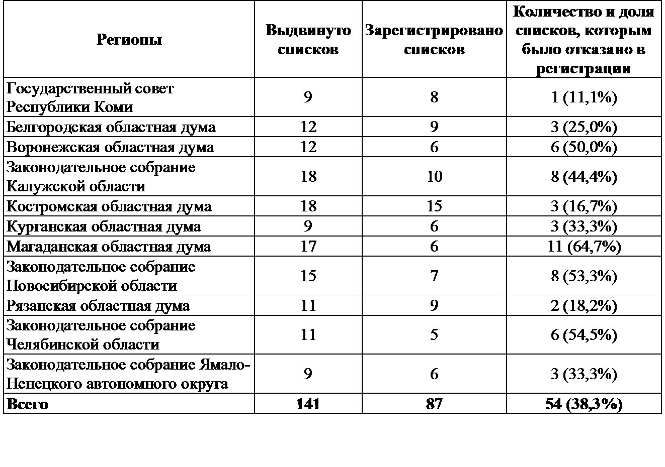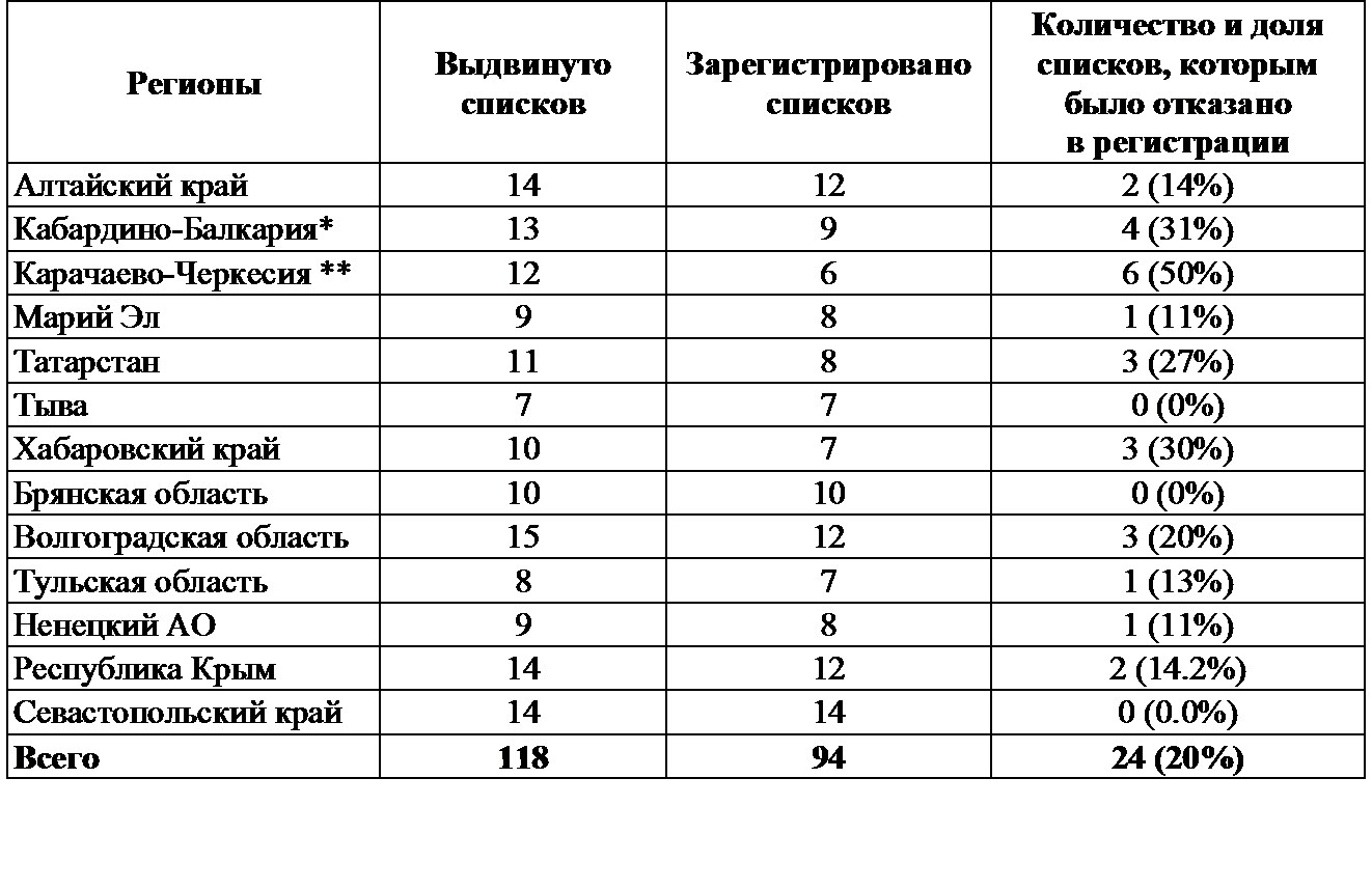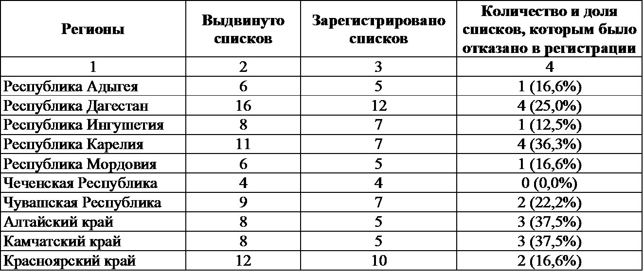 В таблицах 1–3 демонстрируется, что 20% партийных списков было отказано в регистрации на выборах 2014 г.; разброс по этому показателю варьируется от 0% в Брянской области, Тыве и Севастополе до 50% в Карачаево-Черкесии. В 2015 г. общее число отказов выросло до 38,3%, а в четырех регионах процент отказа превысил 50%, например, в Магаданской (64,7), Челябинской (54,5), Новосибирской (53,3) и Воронежской (50%) областях. В 2016 г. 24,3% партийных списков были отклонены, в трех регионах при этом было отсеяно более половины списков (Орловская, Ленинградская и Новгородская области).