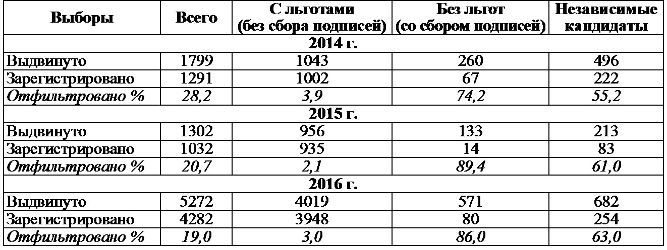 которым было отказано в регистрации списков, показывает, что в подавляющем большинстве случаев это были представители несистемной оппозиции. «Единая Россия» справилась лучше всех с преодолением этого барьера, ни одному из ее партийных списков не было отказано в регистрации в 2014–2016 гг. и почти все кандидаты от партии были зарегистрированы. Другие парламентские партии, а также партии, которым не надо было собирать подписи, также оказались в более выгодном положении, чем несистемная оппозиция.В 2016 г. партии, которым не было необходимости собирать подписи, смогли зарегистрировать почти всех своих кандидатов: ЕР – 99,4%, КПРФ – 99,1, СР – 99, ЛДПР – 98,3, «Яблоко» – 96,3%. В то же время тем, кто должен был предоставить подписи, пришлось хуже: «Патриоты России» зарегистрировали 82,1% списков, «Партия роста» – 74,3, «Родина» – 41,9, а «Российская партия пенсионеров за справедливость» – лишь 59,4%. Кынев и Любарев отмечают значительную региональную вариацию в количестве отклоненных подписей на выборах 2016 г.: от 0,6 до 100% у «Коммунистов России»; от 0,1 до 100% у «Патриотов России»; от 1,3 до 100% у «Родины»; от 1,3 до 36,7% у «Партии роста»; от 0,7 до 100% у РППС; от 2,4 до 99,9% у партии «Зеленые» [ibid, p. 56].