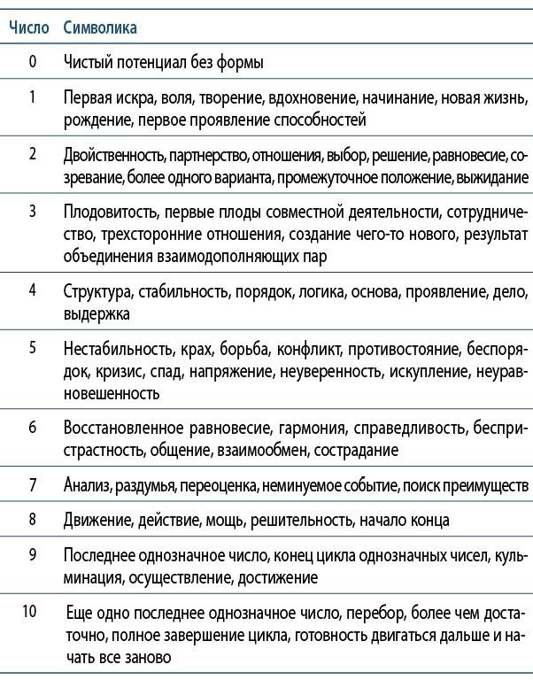 Помимо этого символику Таро определяют через связь между символическими свойствами чисел и картами, соответствующими этим числам. Некоторые из этих свойств приведены в прилагаемой таблице. Познакомившись с Таро ближе, вы, возможно, захотите добавить в этот список собственные значения.