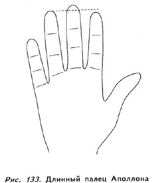 Безымянный палец известен как палец Аполлона, или Солнца. Он символизирует красоту и творческое начало. Этот палец должен доходить до середины ногтя пальца Сатурна (среднего пальца) и приблизительно соответствовать по длине пальцу Юпитера (указательному пальцу) (рис. 132).