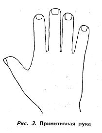 Простая, или примитивная, рука (рис. 3) выглядит несколько грубо. Ее легко распознать по квадратной ладони и коротким, толстым, относительно бесформенным пальцам. Кожа груба и шершава на ощупь. На ладони очень мало линий, иногда не более трех. Люди с примитивными руками могут быть очень упрямыми и мало чем интересуются. Им трудно выразить свои мысли и чувства словами, поэтому время от времени, впадая в отчаяние, они становятся агрессивными. До тех пор пока удовлетворяются их базовые потребности, они спокойно воспринимают все, что преподносит им жизнь, не задумываясь о завтрашнем дне.