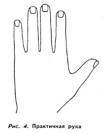 Следующую ступень после примитивной руки занимает рука практичная (рис. 4). Ее ладонь также имеет квадратную форму, но пальцы — более длинные по сравнению с примитивной рукой и обладают более изящной формой. Кожа менее груба, на ладони присутствует большое количество линий. Обладатели практичных рук, как правило, имеют множество интересов и могут увлечься всем, чем угодно, — отсюда и название «практичные».