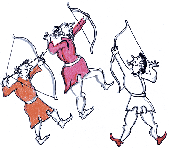 «Ну, нет, – сказали лесники, –Твой выигрыш пропал,Бери свой лук и уходи,Пока не опоздал».И Робин стрелы взял свои,И взял свой честный лук,И улыбнулся про себя,Войдя в широкий луг.Вот стал он стрелы приставлятьК звенящей тетиве,И из пятнадцати враговЧетырнадцать – в траве.Тот, кто затеял этот спор.Собрался убежать,Но Робин Гуд, подняв свой лук,Вернул его опятьИ молвил: «Вновь