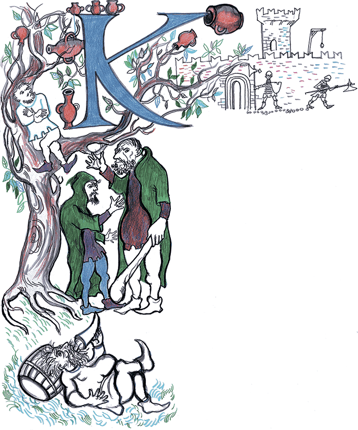 – Твоих я денег не возьму, –Ответил Робин Гуд, –Не купят – за гроши отдам,Рад будет бедный люд.И тут сказал Малютка Джон,Качая головой:– Будь осторожен, командир –Шериф ведь недруг твой!– Друзья, не бойтесь за меня –Со мною Божья Мать!Ей помолясь, любой бедыСмогу я избежать.Он поутру пустился в путь,Чтобы горшки продать,Ну а гончар в кругу стрелковОстался пить-гулять.Телегой правит наш стрелокИ песенки поет.Что было дальше, расскажу –Дивись, честной народ!Дорога быстро довелаДо городских ворот,А вот и площадь у дворца,Где шумный торг идет.Коня распряг он, накормил,Залез в телегу сам.– Кому горшки? – Робин кричит. –Задешево отдам!У врат шерифовых палатРобин толпу собрал –Хозяйки со всех ног бегутКупить его товар.– Горшки, кувшины, – голосит, –Бери за полцены!Купцы вокруг хохочут так,Что падают штаны.Кувшин, что стоил пенсов пять,Он отдавал за два.– Наверно, спятил тот гончар –Разносится молва.Когда осталось пять горшков,Кричать он пересталИ в дар шерифовой женеГоршки все отослал.– Ах, сэр, спасибо! – говоритТа женщина ему. –Коль привезешь еще товар,Всё с радостью возьму.– Гораздо лучше привезу –Ей Робин посулил. –Я для красавицы такойНе пожалею сил.– Сэр, пригласить тебя позвольК шерифу на обед.Служанка понесла горшки,Они за нею вслед.И вместе с госпожой вошелНаш Робин в пышный зал,Шерифу и его гостямЗдоровья пожелал.– Мой муж, гончар нам подарилОтличных пять горшков!– Ну что ж, зови его за стол –Обед уже готов.За стол уселся Робин ГудИ начал есть и пить,А между тем шериф решилВсем новость объявитьО том, что нынче на лугуСтрелки затеют спорИ сорок шиллингов дадутТому, чей глаз остёр.Услышав это, он смолчал,Но про себя решил:– Не допущу, чтобы меняХоть кто-то победил.Доев обед, допив вино,Все гости поднялисьИ двинулись в то место, гдеСтрелки уж собрались.Шерифа люди хороши,И вид у них удал,Но точно в цель никто из нихНи разу не попал.И молвил Робин, чтоб шерифЕго мог услыхать:– Эх, мне бы лук – я б показал,Как надобно стрелять!– Бери же лук, – сказал шериф, –Какой тебе под стать,И то, что славный ты стрелок,Изволь нам доказать.Охапку луков перед нимСложили на траву.На самый лучший натянулВмиг Робин тетиву.– Стреляй и, может быть, хоть разВ мишень ты попадешь.– Уж постараюсь, – он сказал, –Хоть лук не так хорош.К черте подходит Робин Гуд,Стрелу на лук кладет,И с ходу прямо в цель она,Не отклоняясь, бьет.Еще не раз тягались с нимШерифовы стрелки,Но от победы все как естьОстались далеки.Стрелки сгорают от стыда –Гончар их победил.С улыбкой кислою шерифПриз Робину вручил,Осведомившись: – Где ты, сэр,Таких набрался сил?– В моем дому, где в этот часМеня родные ждут,Висит гораздо лучший лук,Что дал мне Робин Гуд.– Коль знаешь Робина, гончар,Мне расскажи о нем.– Немало мы стреляли с нимВ лесу его густом.– Клянусь, сто фунтов дам тебе,Раз ты такой лихой,Когда разбойника тогоМне выдашь головой.– Ну, если так, – сказал гончар, –Готовьтесь утром в путь,И скоро на Робина выСумеете взглянуть.– Отлично! – говорит шериф, –Набраться нужно сил.Он гостя во дворец отвелИ спать там уложил.Чуть свет поднялся Робин Гуд,В телегу впряг коня.Покинуть город он спешит,В лесу – его родня.Зашел к шерифовой жене:– Спасибо за ночлег!Вот золотое вам кольцо,Чтоб помнили вовек.– Храни вас Бог! – ему она,Зардевшись, говорит.Пустились в путь, и рад шериф,Что в лес их пу