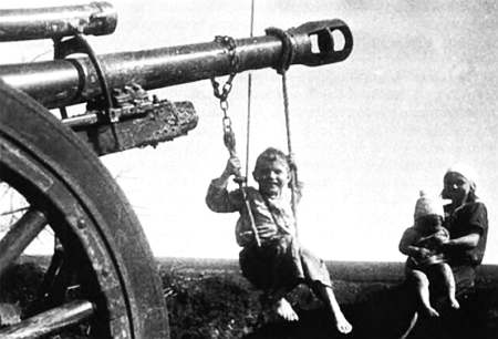 А этот снимок сделан, как оказалось, в 1944 году под Одессой. Картина, как видим, похожая. Немца прогнали. Можно не прятаться в щелях и погребах, можно играть и греться на солнце. Но для качелей в этой деревне, наверное, не осталось ни дерева, ни столба. Зато осталась у дома разбитая пушка. И вот поскрипывают цепь и веревка о пушечный ствол — босоногий человек делает то, что ему полагается делать в свои семь-восемь лет. Где-то еще умирают от огня таких пушек. Еще год будет длиться война. Но ростки жизни тянутся кверху, как только огонь утихает.
