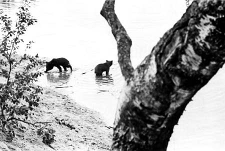 Нашу безмоторную лодку тихо несло теченьем. И на протоках мы были настороже — хотелось медведя увидеть, но так, чтоб с испугу он бы не кинулся к лодке. И нам удавалось наблюдать зверей на реке. В одном месте михайло беспечно брел возле самой воды — как видно, наелся и шел отдыхать. В другом месте медведь в панике кинулся в желтые ивняки. Но они не могли схоронить громадного зверя, и он метнулся к лесу по мелкой воде — с полминуты сверкали брызги. А два медвежонка, еще неопытные в рыболовстве, шумно плескались и позволили нам истратить по нескольку фотопленок…