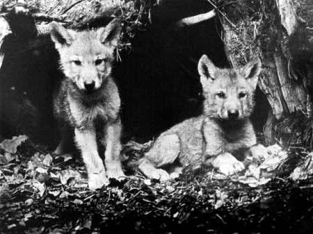 детенышей в логове, когда любой зверь ляжет костьми за потомство, волк трусит. К логову можно подойти без ружья и безнаказанно взять волчат — волчица скрытно и, вероятно, с материнской болью будет наблюдать похищенье, но не покажет себя. Таков результат длительного и постоянного гонения на волков. Жестокая селекция сделала дело. Те, которые защищали потомство, погибали. Выживали осторожные, терпеливые. И осмотрительность эта закрепилась, как сказал бы ученый, на генетическом уровне.Волчата в логове.