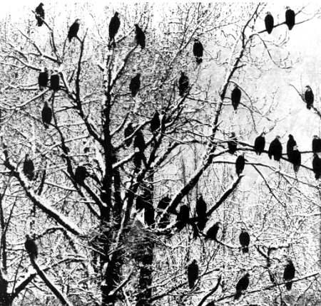 Зима — пора для всех наиболее тяжкая. Большинство птиц улетает от нее в края теплые. Но много их остается и зимовать. Перебиваются кто как. Иные находят пищу легко и живут — не тужат. Например, снегири, свиристели, чижи, щеглы, поползни, дятлы. При хорошем урожае рябины зимовать остаются дрозды. Норовые птицы — тетерева, рябчики, глухари — с лакомых летних кормов (насекомые, ягоды) переходят на еду зимнюю — березовые почки, хвою. Большие синицы, сороки, вороны подтягиваются к жилью человека — тут прокормиться легче. Вороны, неустанно облетая большую кормную территорию, находят падаль и делят ее с волками. Волки голодают и разбойничают, не брезгуя ничем. Но многие звери не бедствуют. Лисица живет охотою на мышей, песцы, куницы, горностаи, соболи тоже промышляют охотой на грызунов. Тепло одетые, они, как посмотришь, кажется, для зимы и родились. Заяц не голодает зимой. А много зайцев: живут — не тужат и рыси. Туго при глубоких снегах и морозах приходится кабанам и косулям.