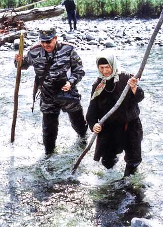 В позапрошлом году Еринат переходили мы вброд. Это было непросто даже для людей опытных. В этом году река вскрылась поздно, половодье на ней было бурным — Еринат вернулся в прежнее русло, вода неслась с бешеной скоростью, катила камни, подмывала деревья по берегам. О переправе вброд нечего было и думать. Вертолет сел на каменный островок, и мы, почти не замочив ног, перебежали к ожидавшим нас на берегу трем людям: Агафье, Ерофею и незнакомому парню, как оказалось, три дня назад пришедшему сюда, одолев по тайге сто пятьдесят километров.
