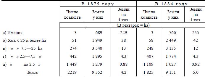 данные о живом весе каждого сорта животных в хозяйствах различного размера. При этом обследование было повторное: первое в 1875 году, второе в 1884. Данные напечатаны Дрекслером [120] в сыром виде, по каждому из трех имении и по трем группам деревень, причем крестьянские хозяйства в деревнях разделены на семь групп по количеству земли (свыше 50 гектаров, 25–50, 12,5–25, 7,5–12,5, 2,5–7,5, 1,25–2,5 и до 1,25 гектара). Если принять во внимание, что данные Дрекслера относятся к 11 различным видам скота, то читателю ясна станет сложность всех этих таблиц. Чтобы получить сводные данные, позволяющие обозреть общие и основные выводы, мы разделим все хозяйства на пять главных групп: а) крупные имения; б) крестьянские хозяйства, имеющие свыше 25 ha (гектаров) земли; в) от 7,5 до 25 ha; г) 2,5–7,5 ha и д) менее 2,5 ha. Число хозяйств в этих группах и количество земли у них было в 1875 и 1884 годах следующее:119
