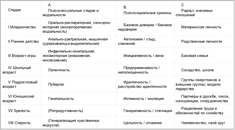 Эти стадии и соответствующие им органы могут быть визуализированы в эпигенетическом порядке, представленном в таблице на с. 39. Для удобства мы советуем читателю также обратиться к таблице 1, колонка А (с. 44–45), которая в общем виде представляет те взаимосвязанные проблемы, которые будут рассматриваться в настоящем эссе.