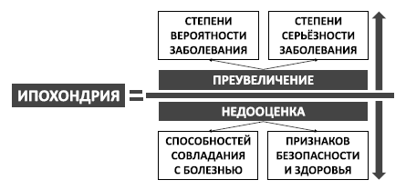 Как и любая другая, тревога, вызванная ипохондрическими переживаниями, образуется вследствие преувеличения степени вероятности и серьезности негативных сценариев развития событий (в данном случае болезней), а также в результате недооценки внешних и внутренних ресурсов (способностей совладания с болезнью) и реальных признаков безопасности (в том числе признаков здоровья) (рис. 13).