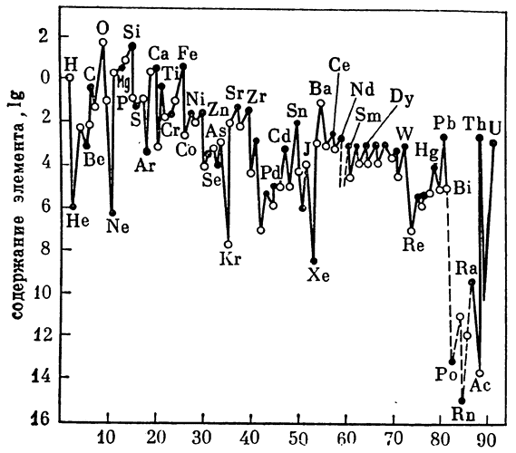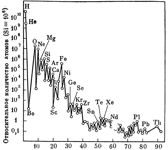 Кривые распространенности элементов на Земле (вверху) и в космосе. «Космическая» кривая отражает исключительную роль водорода и гелия в мироздании и особое значение гелиевой группировки в строении атомного ядра. Наибольшую относительную распространенность имеют те элементы и те их изотопы, массовое число которых делится на четыре: 16O, 20Ne, 24Mg и т. д.