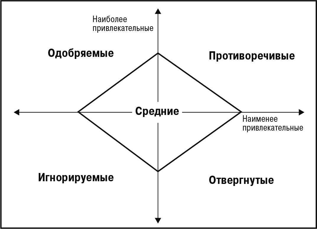 Кои и его коллеги обнаружили, что некоторые дети получили необычно высокий или необычно низкий балл по ряду критериев, что позволило отнести их к одной из четырех социометрических групп, расположенных по углам матрицы. Дети, попавшие в левый верхний квадрант, нравились одноклассникам. Их почти никто не считал непривлекательными. Кои назвал эту группу «популярные», но их также можно определить как «одобряемые», поскольку их тип популярности основан исключительно на привлекательности. Противоположный квадрант в правом нижнем углу вместил в себя «отвергнутых», то есть тех, кто мало кому нравится и многим не нравится. Дети, которых редко называли привлекательными или непривлекательными («невидимые»), были помещены в нижний левый квадрант и названы «игнорируемыми». Для сравнения: группа в верхней правой ячейке (те, кто нравился и не нравился окружающим приблизительно в равной степени) состояла из наиболее заметных членов коллектива. Таких детей назвали «противоречивыми», потому что сверстники их либо любили, либо ненавидели. «Противоречивые» встречаются относительно редко, они представляют собой самую малочисленную социометрическую группу. В сумме «одобряемые», «отвергнутые», «игнорируемые» и «противоречивые» дети составили около 60 % коллектива. Оставшихся Кои назвал «средними». Эта группа была самой многочисленной. Стоит отметить, что, несмотря на то что такие дети не получили особого количества номинаций (их не часто называли самыми привлекательными или непривлекательными), большинство «средних» все-таки приближается к одной из других категорий.