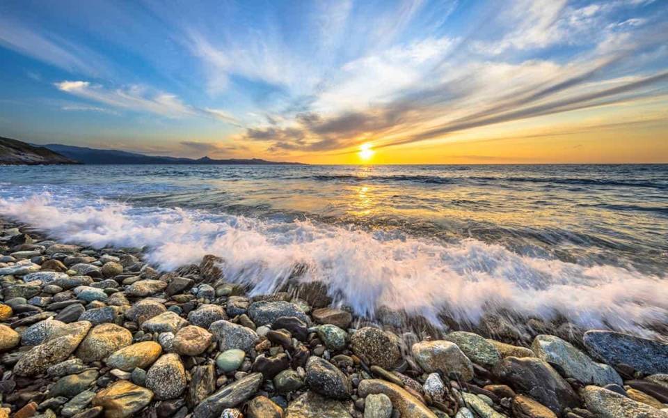 Снова подступает вечер… Закат на море красивый, и какой-то печальный. Где-то вдалеке играет музыка. Но у нас тут рядом ничего увеселительного нет. Поэтому за шумом прибоя даже не особо и слышно, что за музыка играет… Бу-бу-бу и всё…