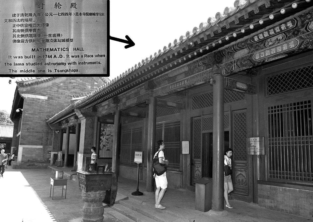 Рис. 89. «Математическая палата» в монастыре Далай-ламы, где, как говорится в пояснительной табличке (она врезана слева вверху), Далай-лама «изучал астрономию с помощью инструментов». Фотография 2010 года.
