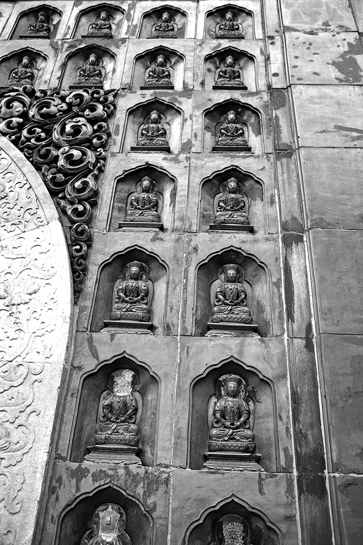 Рис. 22. Фрагмент наружной стены буддийского храма, представленного на предыдущей фотографии. Вся поверхность стены покрыта изразцами с изображением сидящих Будд. Лица некоторых из них сбиты. Фотография 2009 года.