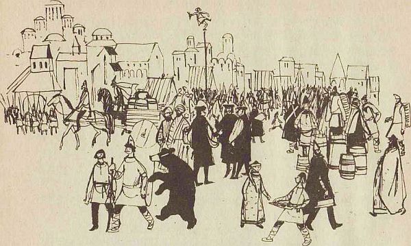 Анну Ярославну этими товарами не соблазнишь. В княжий замок купцы ещё получше приносят. А посреди площади мальчишечка на верхушке высокого шеста пляшет. Такого она ещё не видала. Ох, страшно смотреть. Уж он пляшет, пляшет, то одну ногу подымет, то другую, то на голову ста нет, а с шеста не падает. Вот чудеса!