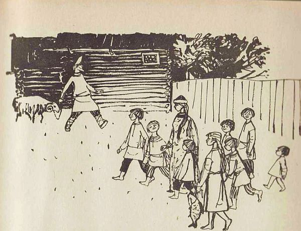 Вот они идут, а навстречу им выбегают семеро мальчиков, мал мала меньше, все на одно лицо, бегут и кричат: