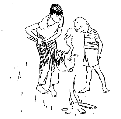 Он зацепил кастрюлю палкой за ручку и понес к реке. Ни он, ни Павлик не подумали, что этого нельзя было делать. Попав в воду, горячая кастрюля совсем облупилась.