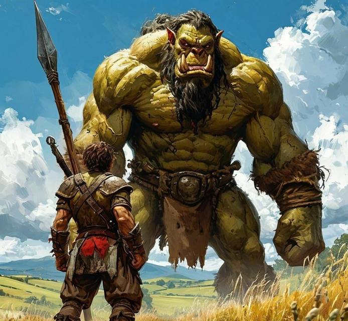 Раздался ужасающий треск, звук удара или падения о землю чего-то твердого, и вдруг из стены деревьев-великанов буквально вылетело нечто грязно-серое, прокатившееся по инерции практически до самого забора моего участка. Спустя пару секунд вслед за непонятным предметом из-за огромных стволов вылетел огромный мужик с дубиной, кожа которого была ярко-зеленого цвета. Она был выше меня метра на два и возвышался над домом, как Гулливер над лилипутом. Комок, лежащий под забором, чуть шевельнулся и застонал. Женским голосом. Это придало мне сил и смелости. Сжав в руке горячую ручку Экскалибура, перемахиваю через заборчик, становясь между чудовищем и его жертвой, угрожающе выставив вперед… копье? Когда он только успел?