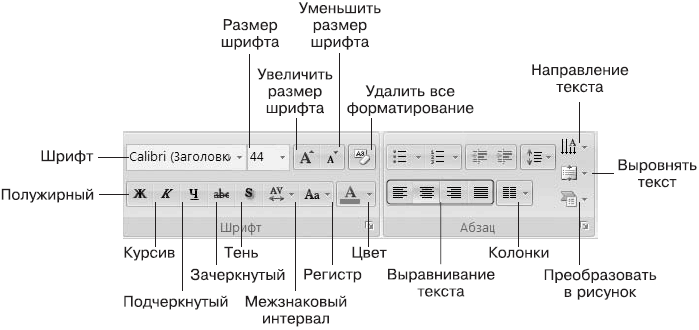 Изменения текста в слайде, удаление, копирование или вставка текста называются редактированием. Все инструменты для редактирования текста можно увидеть на вкладке Главная (рис. 9.1).