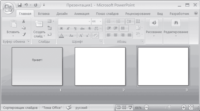 Это новый инструмент PowerPoint 2007. В этом виде возможно отображение 25 слайдов из презентации одновременно. Пользователь может манипулировать слайдами на свое усмотрение (рис. 12.1). Чтобы переключиться из обычного вида в Сортировщик слайдов, нужно нажать кнопку Сортировщик слайдов в строке состояния.