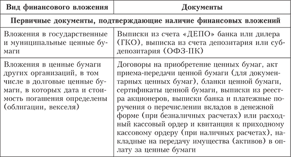 Таблица 7.1. Подтверждение наличия финансовых вложений первичными документами