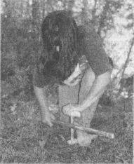 Теперь соберите конструкцию так, как это показано на иллюстрации, поместив тупой конец бура в зарубку на основе. Начните вращательно–поступательные движения, постепенно нагнетая давление и скорость, что должно вызвать начальное тление у основания бура. Как только место тления разрастётся до размеров нижней ножки бура, обрежьте тлеющую зарубку от края основы до центра. Зарубка для ножки бура обычно занимает 1/ 8всей окружности тления.