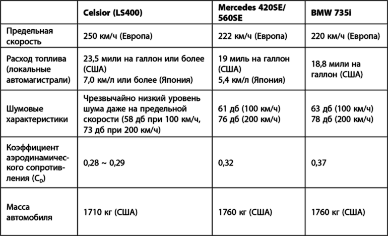 На рис. 5.3 приведены технические характеристики будущего Lexus в сравнении с показателями основных конкурентов – BMW и Mercedes. Так Судзуки определил задачи, которые предстояло решить. Он считал, что Toyota справится с ними. «Когда я показал эти цифры инженерам Toyota, они смеялись надо мной. Они сказали, что это невозможно», – рассказывает Судзуки.