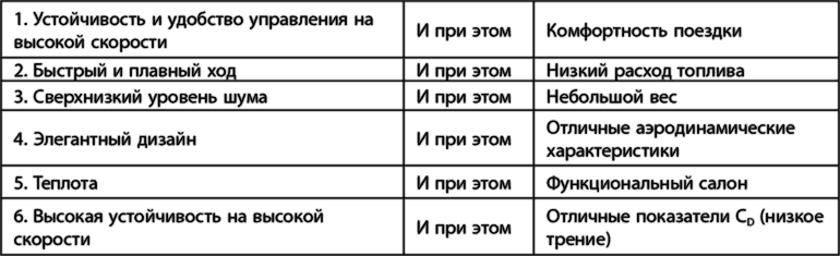 Судзуки объясняет, что устройство, поглощающее шум, не является радикальным решением проблемы и к тому же увеличивает массу автомобиля. Источником шума и вибрации является двигатель. Одна из методик кайдзен (непрерывного совершенствования – принцип 14) требует пять раз задать вопрос «Почему?»: почему возникает проблема, приближаясь с каждым «почему» к ее первопричине. Судзуки пришел к выводу, что он может устранить шум, который издает двигатель, не наращивая массу машины. Для этого нужно заняться первоисточником проблемы. Он составил список технических характеристик, которые являлись взаимоисключающими и которыми должна была обладать будущая машина. Так, например, ему хотелось, чтобы машина была управляемой и устойчивой на высокой скорости и при этом комфортной. Эти пары несовместимых требований представлены на рис. 5.4. Так были определены две основные задачи при создании Lexus: