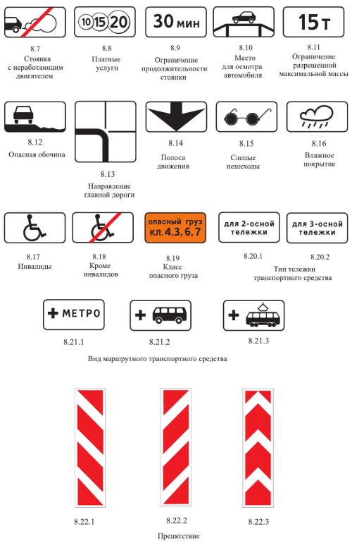2.1.1–2.1.3 – обозначают элементы дорожных сооружений (опор мостов, путепроводов, торцовых частей парапетов и т. п.), когда эти элементы представляют опасность для движущихся транспортных средств;