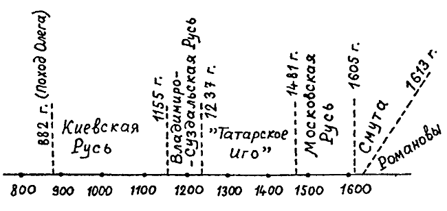 Рис. 1. Общая схема традиционного «учебника по русской истории». Отмечены основные исторические периоды, на которые романовские историки разбили древнерусскую историю. Считается, будто все эти периоды различны.