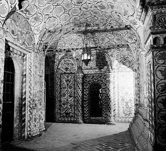 Рис. 7. Старая роспись XVI века, раскрытая в соборе Василия Блаженного на Красной площади в Москве. Так собор был расписан первоначально, когда был построен — во второй половине XVI века. Никаких изображений людей, животных и даже птиц в его росписи не было. Только растительный узор. Современная фотография.