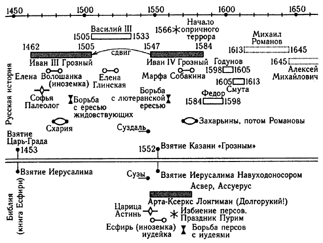 Рис. 11. Соответствие между событиями библейской книги Есфирь и событиями русской истории XVI века, а также отражение этих событий в русской истории XV века из-за хронологической ошибки примерно на 100 лет («100-летний хронологический сдвиг» в романовской версии русской истории).