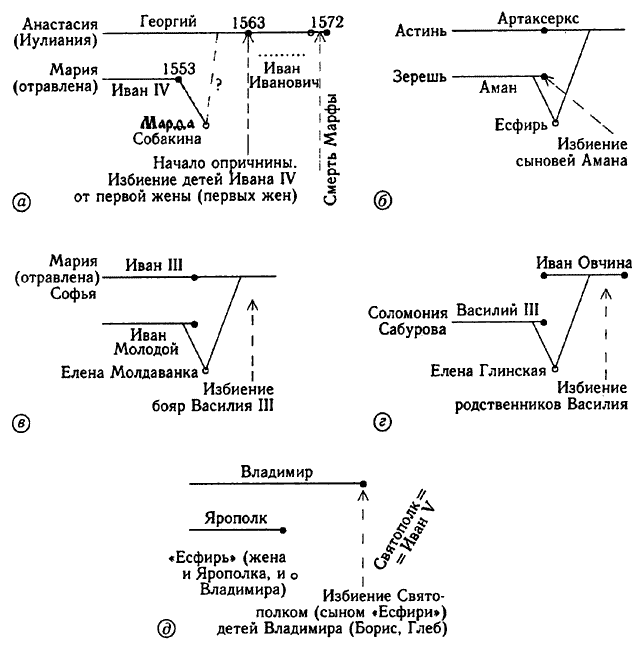 Рис. 12. Условная схема основных событий книги Есфирь в русской истории (оригинал XVI века и четыре его дубликата, возникшие из-за хронологических ошибок в романовской версии русской истории).