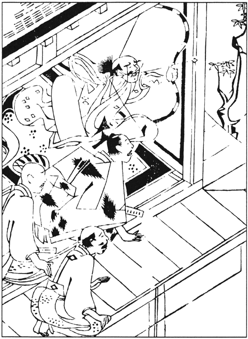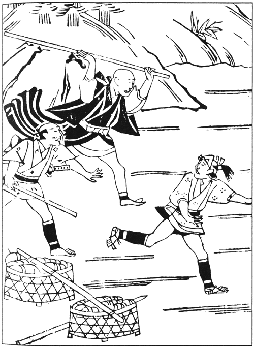 — Тут пришёл один преподобный, на вид — китайский монах, и спрашивает: «Где Иккю?» Возвращайтесь в монастырь поскорее! — пытался он растормошить Иккю, а тот шатался, не открывая глаз. Тут подоспел хозяин питейного дома: