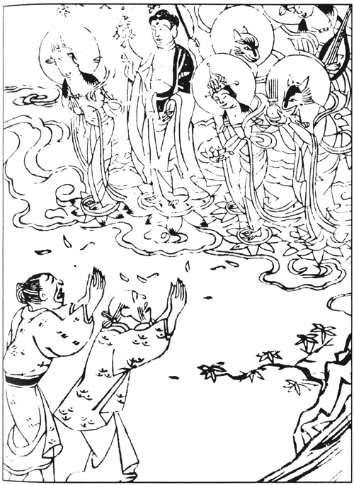 Когда все пребывали в печали, на ясном небе с западной стороны начали громоздиться лиловые облака и заполонили всё небо, зазвучала музыка, разлилось несказанное благоухание и пошёл дождь из лепестков. Что за чудо! Сюда снизошли Три почитаемых [94] и двадцать пять бодхисаттв, а за ними — озарённый сиянием сонм праведников. Удивительное, чудесное знамение! Не было таких, кто не восхитился бы: