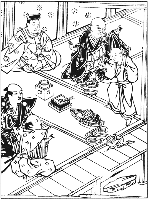 Рассказывают, что преподобный Иккю с самого детства отличался от других людей догадливостью и сообразительностью. Тогда он учился у своего наставника Касо, стоял конец «безводной» луны [322] , страшная жара иссушала землю, деревья не колыхались под ветром, палящий зной жёг подобно пламени, и как раз тогда внезапно прибыл к Касо некий высокородный вельможа. В кельях засуетились, открыли створни и занавеси южных гостевых покоев, пригласили гостя в эти покои, где шуму ветра в соснах и журчанию ручья вторило стрекотание цикад на ветвях, отгоняя жару. Ещё, чтобы угостить высокого посетителя, в большую чашу положили студенистых сладостей, наполнили водой и установили на подставке. Иккю, с детства отличавшийся силой, внёс всё это в комнату без видимых усилий, когда высокий гость сказал: