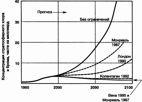 Зафиксированные и прогнозируемые концентрации хлора и брома в стратосфере при различных условиях: без протокола, в соответствии с первым Монреальским протоколом, в соответствии с более поздними соглашениями. Сохранение производства ХФУ на уровне 1986 г. приведет к продолжению роста концентрации стратосферного хлора вплоть до восьмикратного увеличения к 2050 г. Первый Монреальский протокол требовал ограничить объемы выбросов, но их все еще было достаточно для того, чтобы концентрация хлора росла экспоненциально. Лондонское соглашение определяло свертывание использования большинства видов ХФУ (но не всех), оно по-прежнему позволяло концентрации хлора расти примерно до 2050 г. Последовательные соглашения постепенно снижали допустимые уровни использования соединений, приводящих к высвобождению активного хлора, добиваясь, чтобы прогнозируемые концентрации стратосферного хлора уменьшались, начиная уже с 2000 г. (Источники: WMO; ЕРА; R.E. Bendick.)