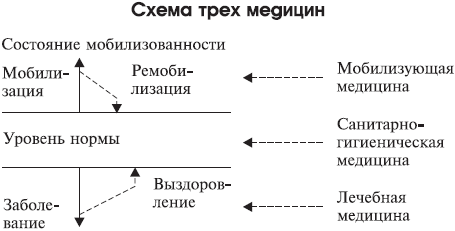 В процессе проводимой работы сформировалось представление о «трех медицинах» (см. схему): лечебной, призванной возвращать здоровье заболевшим; санитарно-гигиенической, задача которой – сохранять здоровье здоровым людям, и наконец, о мобилизующей. Сущность последней – обеспечить правильную (то есть не допускающую «поломок» в организме) мобилизацию тех потенциальных сил, которые необходимы для успешного проведения тренировок и достижения высоких результатов на соревнованиях.