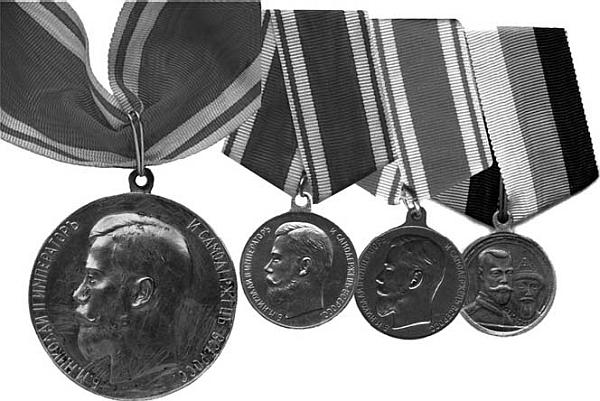 Шейная серебряная медаль “За усердие” на Станиславской ленте, золотая и серебряная медали “За усердие” на Станиславской ленте и медаль “В память 300-летия Российского Императорского Дома Романовых”, которыми Т. И. Чемадуров был награждён за многолетнюю верную службу