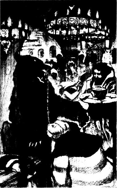 Князь не пошел на поклон к зверю. Было ему не до потехи: томила его тяжкая дума. Облокотившись на стол, сидел он и не видел, что творилось в палате. А кругом его сновали веселые люди: кто плясал, вздевши на себя бесовскую харю, кто кричал песню, а кто и просто ходил вприскочку. Не по одной чаре было выпито, и вино всех разбирало.