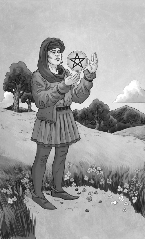 Паж Пентаклей – самый молодой член двора Пентаклей. Как правило, ему от восьми до двенадцати лет, он любопытен, но осторожен по своей природе. Наблюдение за миром природы, его узорами, моделями и схемами – одно из его любимых времяпрепровождений. Олицетворение с миром дает ему невиданную силу. Молодой Паж часто проявляет сходство с животными, и, даже находясь в отдалении, он отдает предпочтение инстинктам. Нередко Паж имеет глубокие знания о таких животных, деревьях и географических местоположениях, о которых вам не случалось даже слышать.