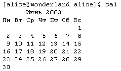 Поданная без аргументов, команда «cal» выводит календарь на текущий месяц. Однако она может вывести календарь и на другой месяц, а также на целый год (Рис. 1-5).