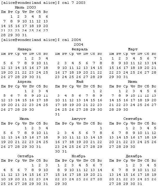 Как мы видим, вывод команды может существенным образом зависеть от аргументов. В данном случае смысл аргументов прозрачен: в первом примере ими были порядковый номер месяца и год, соответствующие месяцу, на который мы хотели получить календарь, а во втором – только год.
