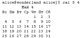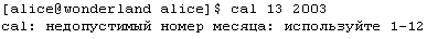 Иногда оператор может ввести команду, корректную синтаксически, но не соответствующую задаче, то есть совершить семантическую ошибку. В следующем примере (Рис. 1-7) Алиса хотела получить календарь на апрель пятого года, но перепутала порядок следования аргументов.
