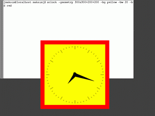 Запустим программу «xclock» (Рис. 2-3). При ее запуске мы использовали несколько параметров, задающих геометрию (местоположение и размер) вновь порождаемого окна, цвет его фона и шрифта по умолчанию, толщину и цвет рамки. Эти (и некоторые другие) параметры типичны для программ, построенных на основе графической библиотеки «X Toolkit». Значения параметров, заданные при вызове программы, могут быть перекрыты самим запускающимся приложением, кроме опции геометрии. Дело в том, что окно выделяется клиентскому приложению при запуске, и все доступные ему ресурсы этим окном и ограничены – это свойство X-протокола.