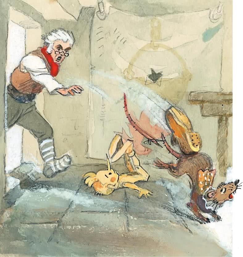Вдруг из-за холста вылезла страшная крыса Шушера и кинулась на Буратино.